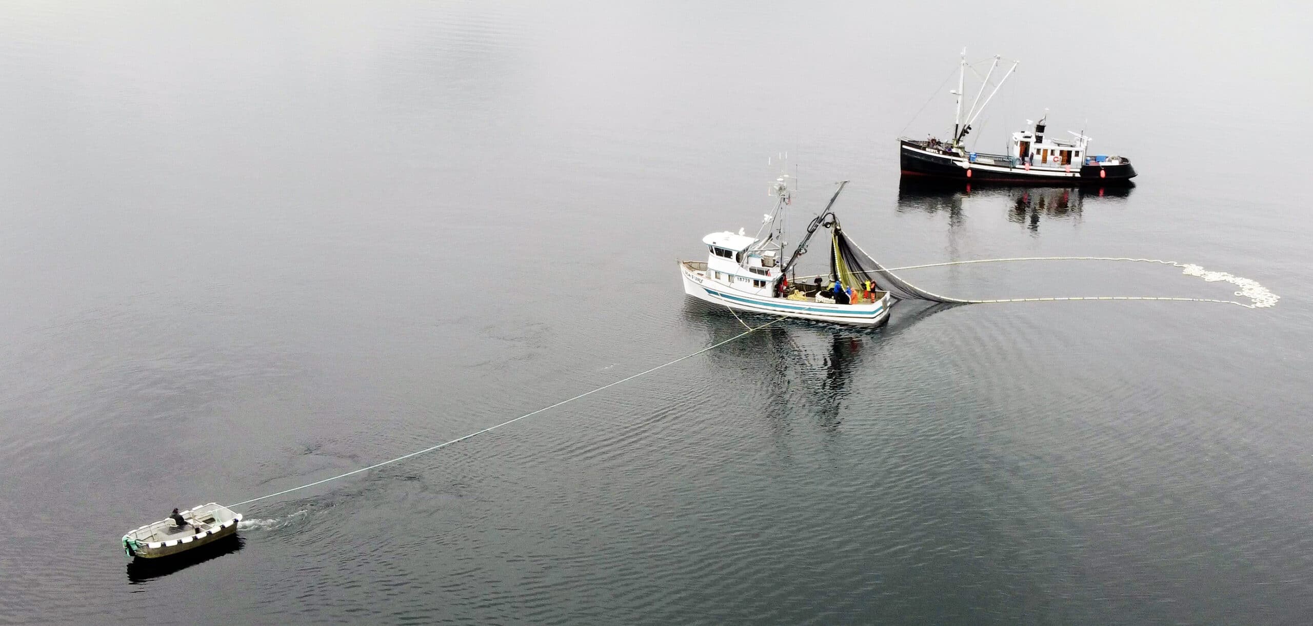 A full demonstration of purse-seine fishing involves the trawler, a small power skiff, and a nearby tender to receive the catch. Photo by Trevor Nordeen