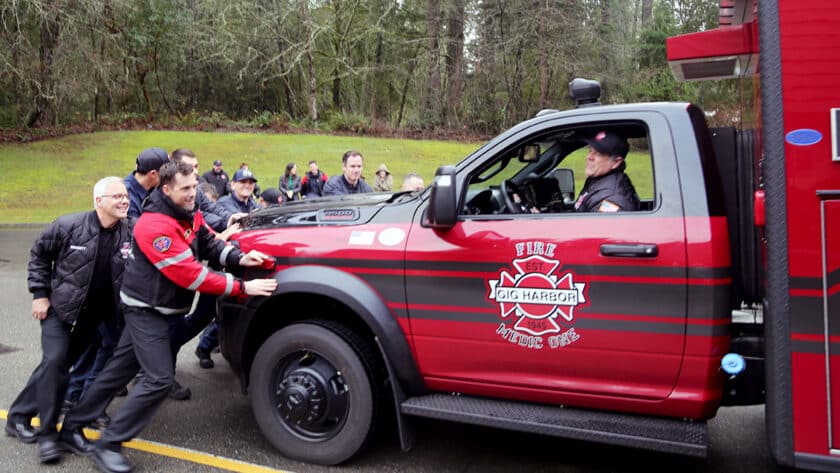 It’s a fire service tradition to push new apparatus in to the station, as firefighters did ‘before we had reverse on the transmission.’