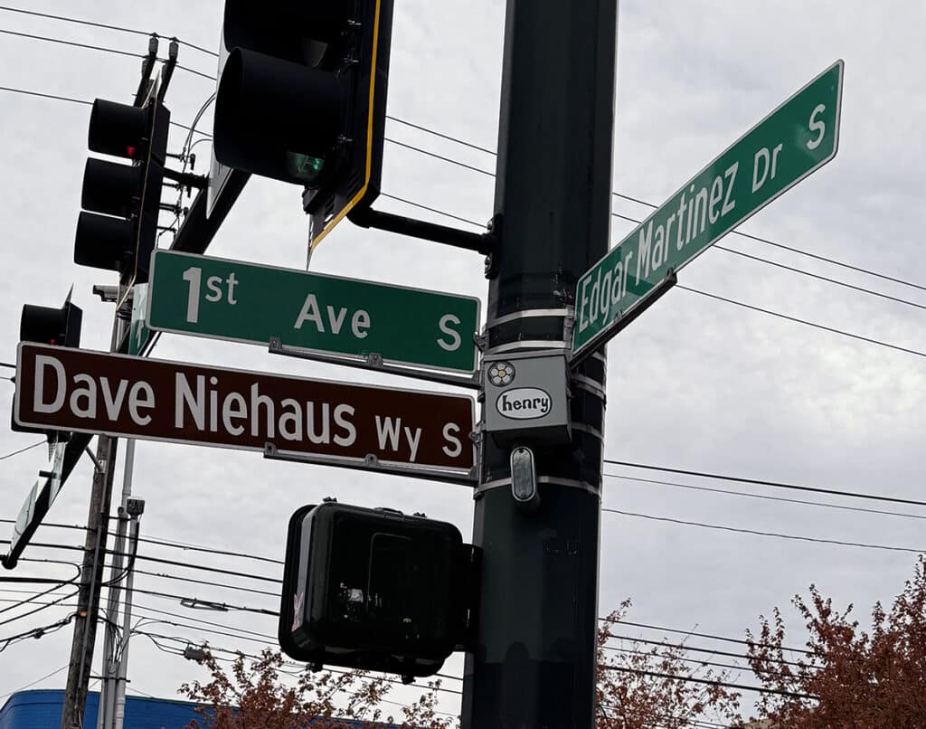 Two streets — one named for longtime Mariner superstar and Hall of Famer Edgar Martinez, the other for Hall of Fame broadcaster Dave Niehaus — border the stadium.