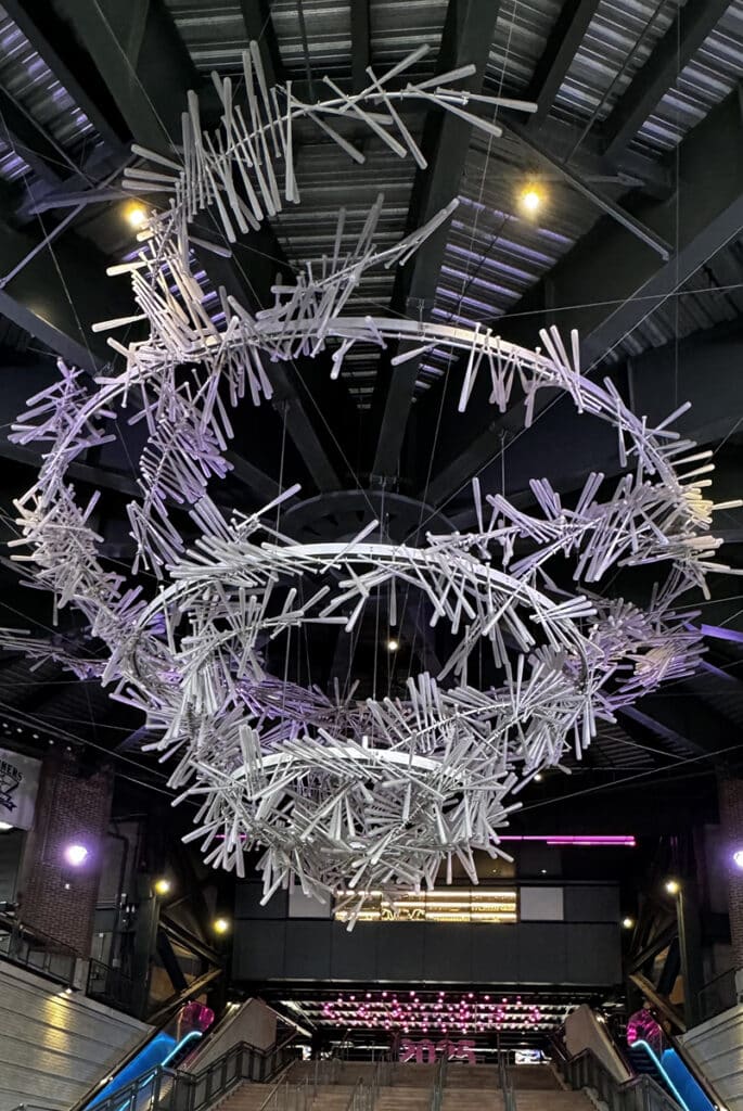 - “The Tempest,” a chandelier made of 1,000 resin baseball bats above the home plate entrance. It hovers over a 27-foot diameter compass rose mosaic at the home plate rotunda.