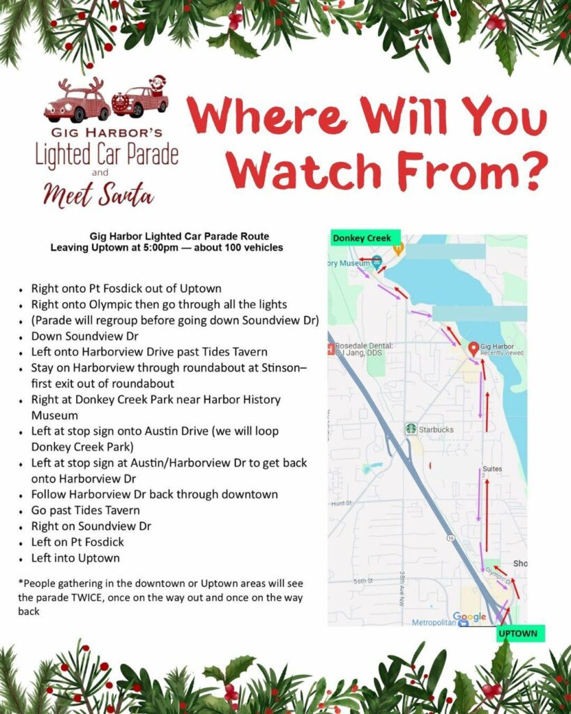 Santa’s Village in Uptown will be open from 4 to 5:30 p.m. that day with treats and games. Bring a donation of nonperishable food, personal items or new, unwrapped toys for donation to Gig Harbor Peninsula FISH Food Bank.