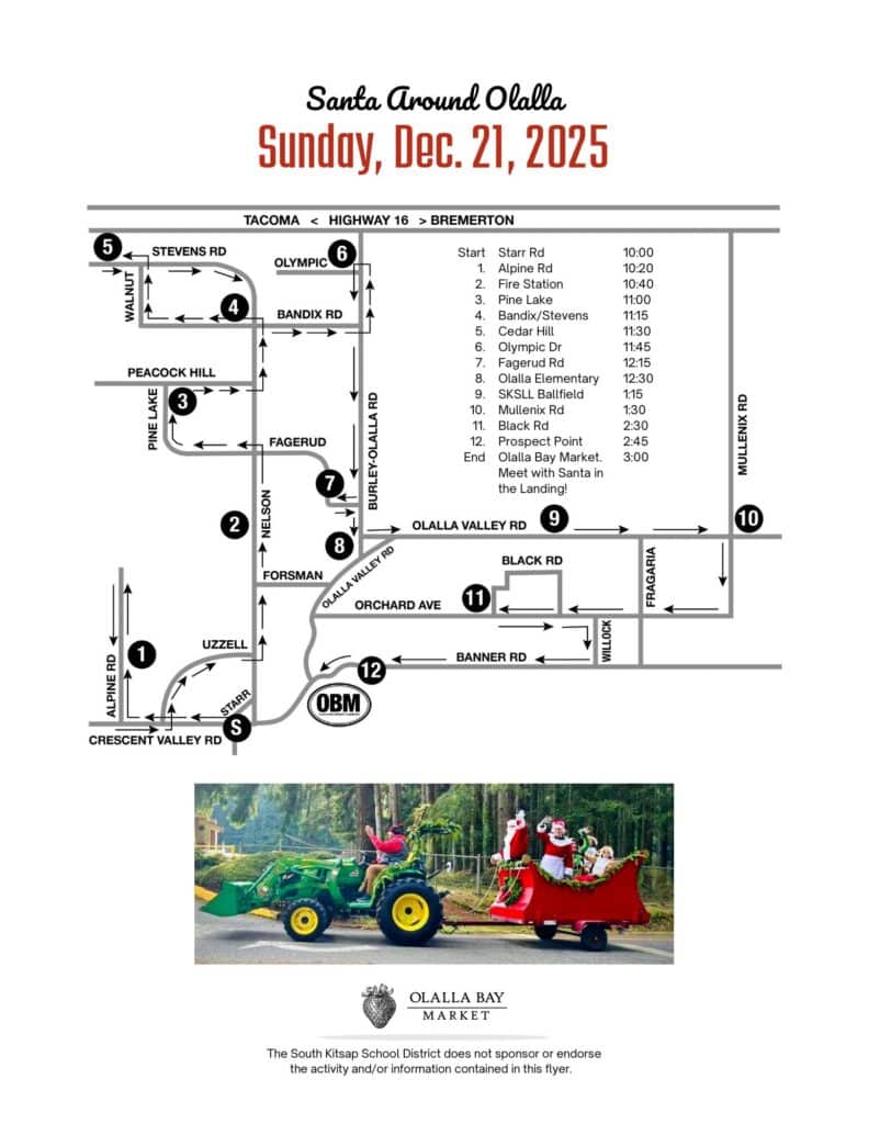 Santa and his elves will make the rounds in Olalla starting at 10 a.m. Sunday, Dec. 21, on his big green tractor pulling a wagon loaded with goodies. He’ll end the day around 3 p.m. at Olalla Bay Market, where you can also contribute to the food donation bin.