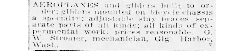 Stromer was one of only a small handful of local budding aviators mentioned in Tacoma newspapers at the time, and none of them were named Stone. It is a fact that Stromer lived in Gig Harbor in 1911, and he was manufacturing and selling aeroplane parts there. He was also taking orders for custom-built aeroplanes and gliders. This is his classified ad in the February 16, 1911, edition of The Tacoma Daily Ledger: