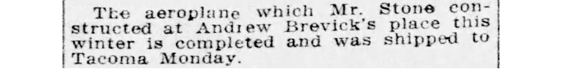 The assumed first aeroplane built in Gig Harbor was shipped to Tacoma for its first flight, as reported in the Gig Harbor news column in the April 30, 1911, Tacoma Daily Ledger.