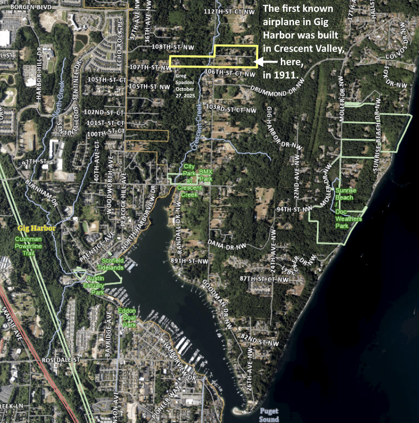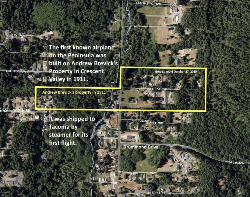 It was on Andrew Brevick’s property that the first known airplane on the Peninsula was constructed. It was shipped to Tacoma by boat for flying. Pierce County Assessor-Treasurer aerial base map.