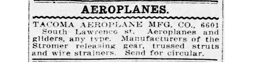 Gustav Stromer’s 1911 ad for aeroplanes and parts while living in Gig Harbor appears to have run only twice, on consecutive days.