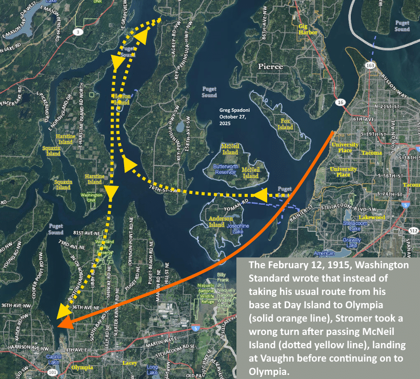 Although Stromer didn’t take off from Gig Harbor with his new aeroplane in 1911, he may have flown one of his hydro-aeroplanes to and from Gig Harbor, as his base at Day Island is only a short hop away. According to the February 12, 1915, Washington Standard, he did land and take off from the Key Peninsula. While heading to Olympia from Tacoma, on a route he’d taken several times before, the newspaper reported that “Stromer lost his way, taking the wrong turn after passing McNeil’s Island and landing first at Vaughn.”
