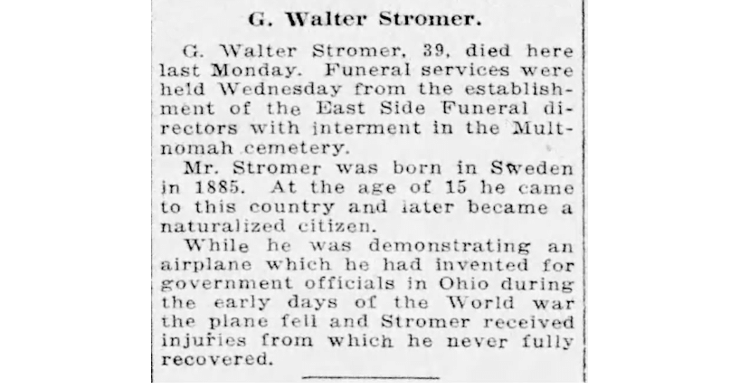The 6-foot-2, 205-pound Stromer — who went by many first names, including Gustave, Gus, George, and Walter — was almost killed in a crash while performing a demonstration for the U.S. military in 1918. Early news reports said he wasn’t expected to survive, but he did. He returned to Tacoma to recuperate.