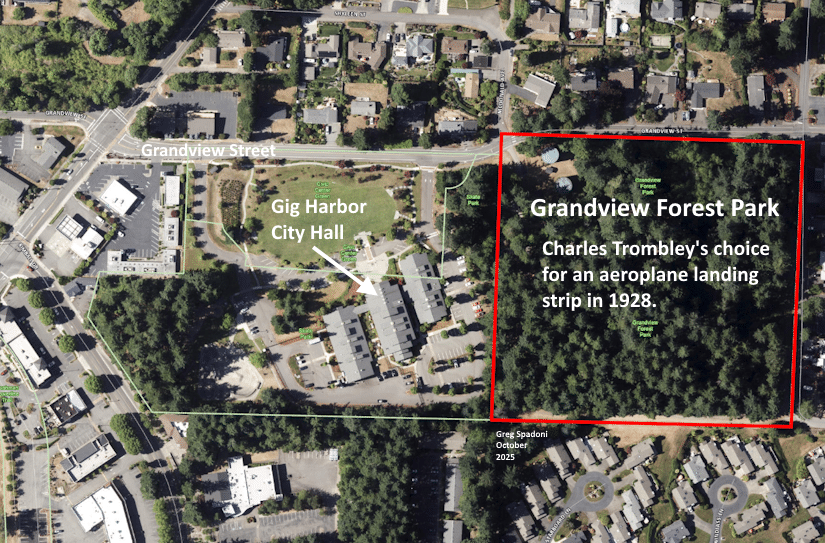 The owner and editor of The Peninsula Gateway, Charles Trombley, claimed this square ten acres would make a fine airport with just a little hard work. Pierce County Assessor-Treasurer aerial base map.
