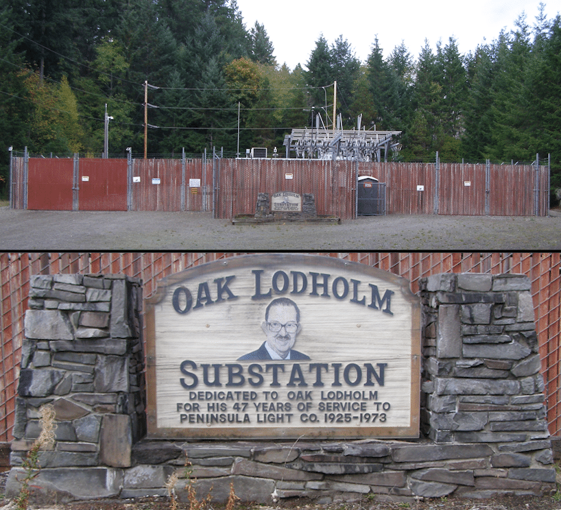 Last month, Mike McNellis told me about a beautiful sign at one of the Peninsula Light Company substations that almost nobody gets to see because it’s well off the nearest public road. It honors one of the Light Co.’s longest serving employees, Oak Lodholm, with most of his 47 years spent as the general manager. I went there, and took pictures. Now lots of people can see it.