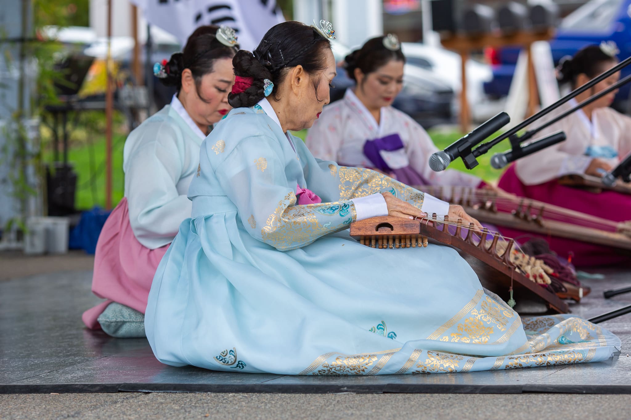Traditional Korean music serenaded the festival. Musicians, sitting on the stage floor, plucked the strings of a kayagŭm, a kind of Korean zither with 12 silk strings, recognized as the national instrument of Korea. The musician positions one end of the instrument on their right knee while placing the other end on the floor. The kayagŭm emits a gentle and elegant sound, and plays an important role in the cultural life of Korean people.