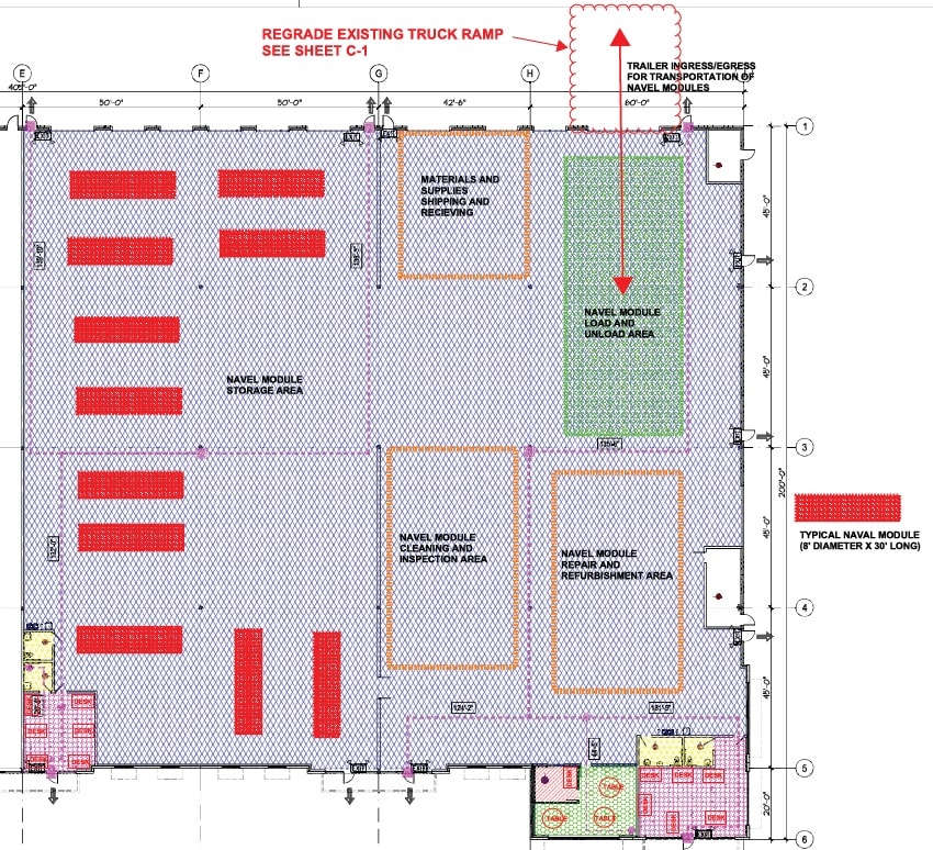 Plans on file with the city show a small part of General Dynamics’ almost-37,000 square foot workplace taken up by offices, restrooms and a break room. But most of the facility is to be used for storing, repairing, refurbishing, cleaning and inspecting “naval modules,” according to the plans. These are described as being 30 feet long and eight feet in diameter.