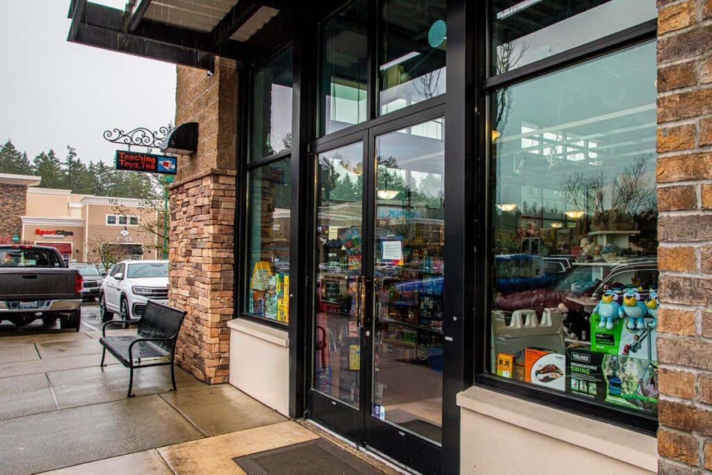 The sign on the door of Teaching Toys Too read: Sign on their Gig Harbor store door says: