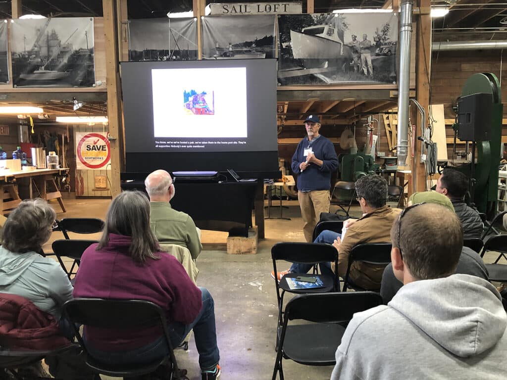 Guy Hoppen, president of the Gig Harbor BoatShop at the historic Eddon Boatyard, talked about Gig Harbor’s working waterfront and how the community came together in 2005 to save the boat shop. Residents voted overwhelmingly (62%) to purchase the boat yard property and preserve its traditional use.