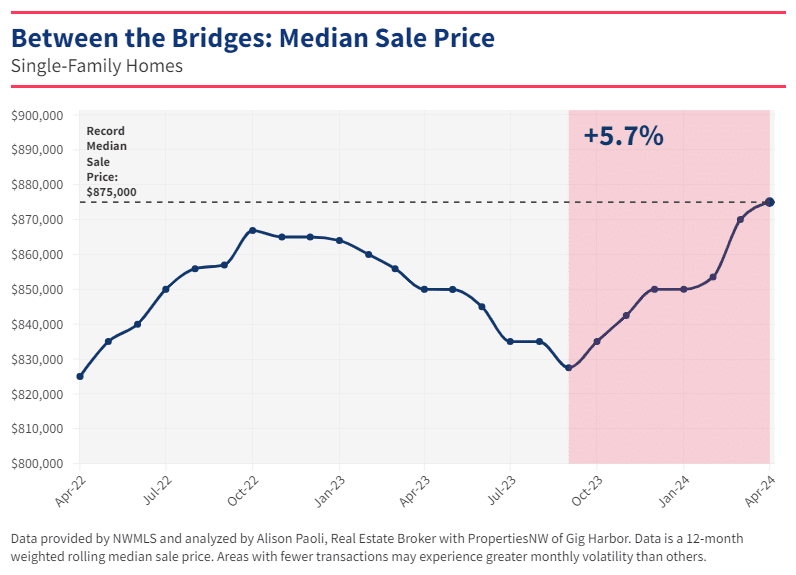 Median home prices hit a new record of $875,000 for a single-family home between the Purdy and Narrows bridges, including Fox Island, according to data from the NWMLS. The figure for a single-family is up $25,000 since the first of the year and nearly $50,000 (+5.7%) since the median price bottomed out in September 2023, following the significant mortgage rate spike that saw the 30-year fixed interest rate jump to nearly 8%.