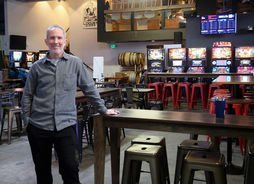 Jason Spears in the revamped arcade and dining area at Locust Cider in Gig Harbor. The tap room next to the Inn at Gig Harbor will remain open as Locust closes other locations in Washington state. Photo by Vince Dice