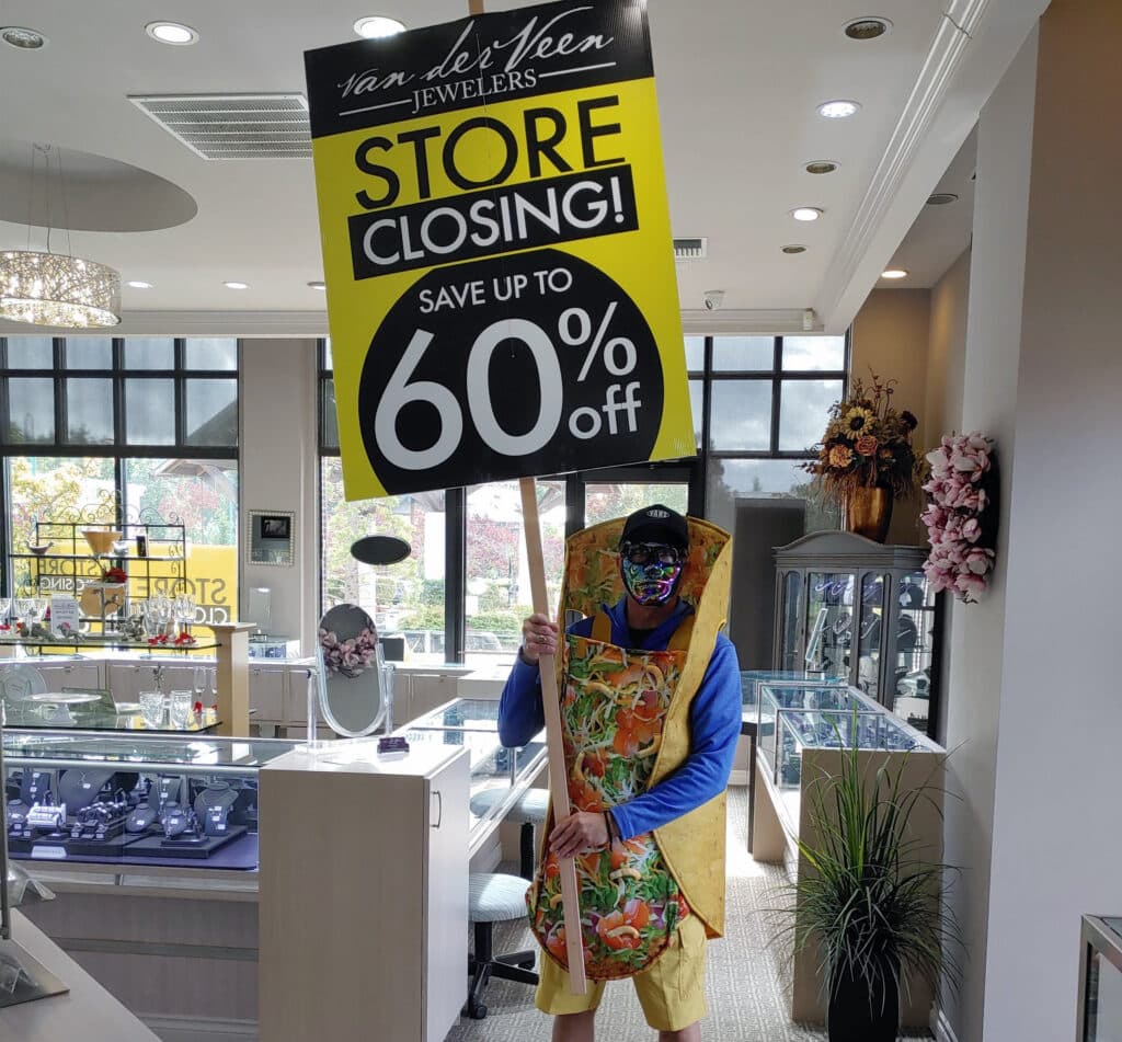 Chris Korbel dressed like a taco and held a sign on Point Fosdick Drive to drum up business. Discounts at the store are now up to 75% off. Photo courtesy of Chris Korbel