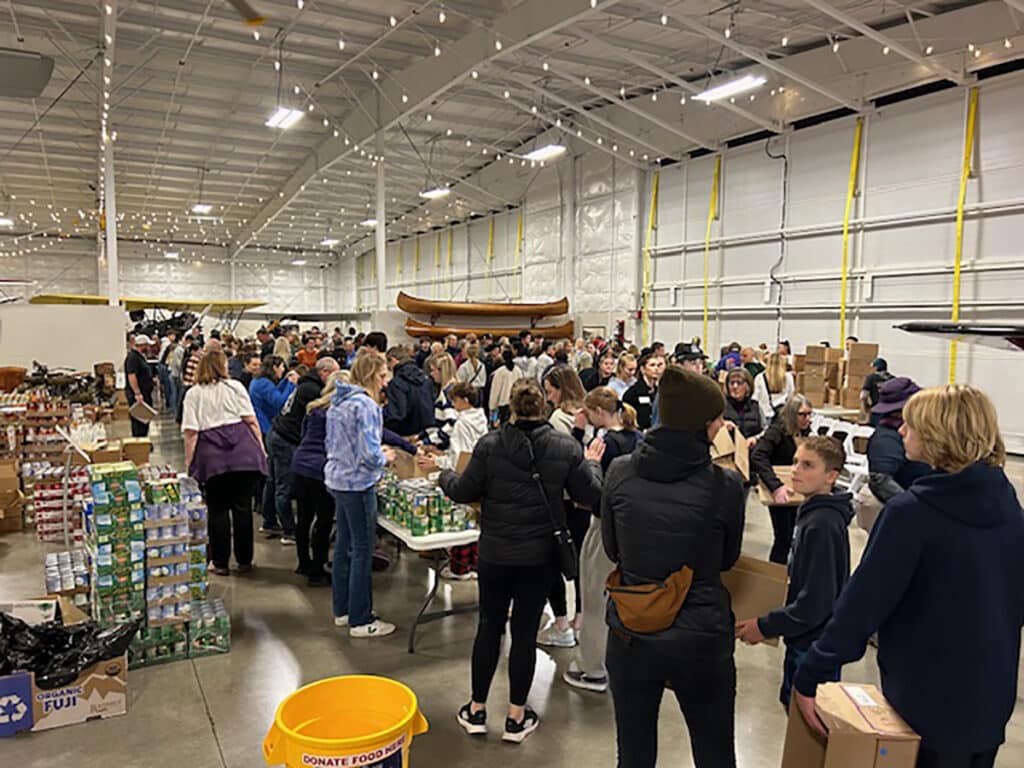 Last year, more than 400 volunteers helped sort and pack boxes of Thanksgiving meals for Basket Brigade recipients. The Basket Brigade is part of the nonprofit Greater Gig Harbor Foundation, which plans to serve 800 families this year. Photo courtesy of Greater Gig Harbor Foundation