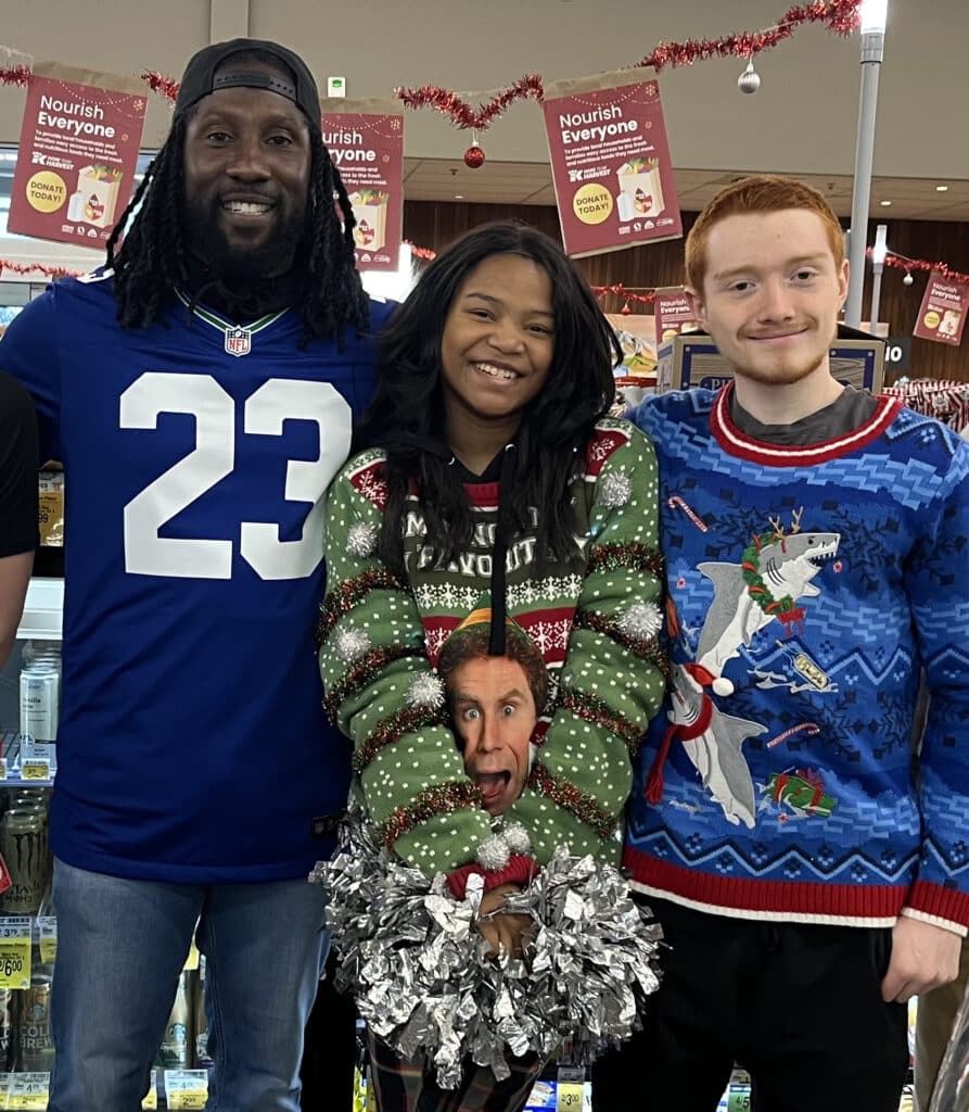 Former Seattle Seahawk Marcus Trufant showed support for Peninsula High School Key Club members Samaria Parr and Remi Higbee as they raised funds for Gig Harbor Peninsula FISH Food Bank last year. Photo courtesy of Rebecca Becnel