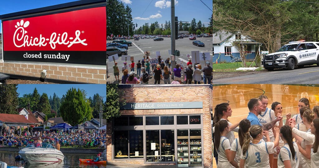 A collage of images from our most popular stories of 2025. Clockwise from top left, Chick-fil-A plans a new Gig Harbor location; a No Kings protest in June; the scene of a double homicide near Gig Harbor; a Summer Sounds at Skansie concert; the Heritage Distilling tasting room on Harborview Drive; and the 2024-25 Gig Harbor High girls basketball team.