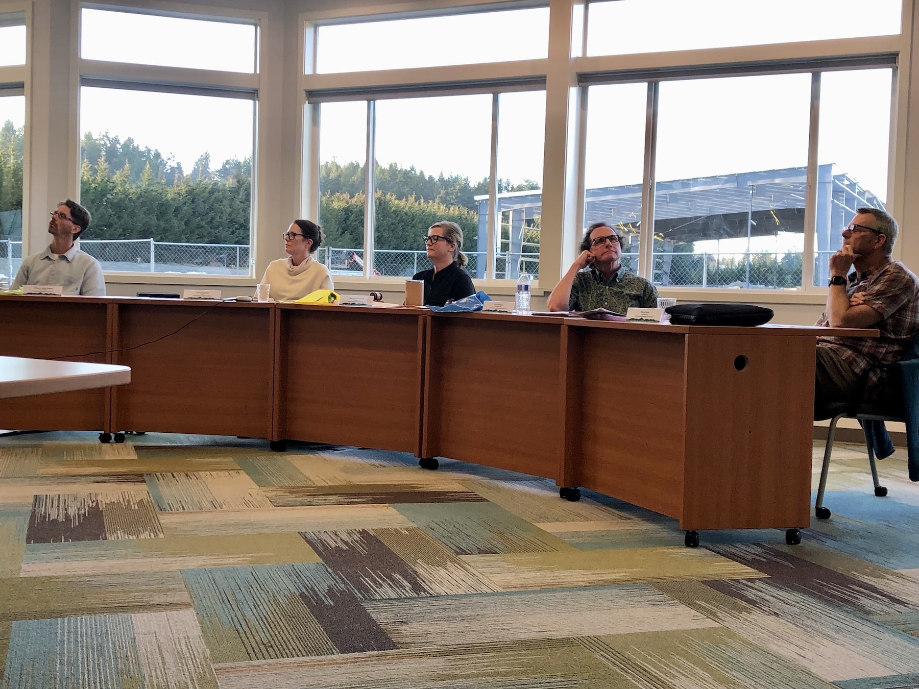 PenMet commissioners, from left, Billy Sehmel, Laurel Kingsbury, Missy Hill, Kurt Grimmer and Steve Nixon listen at Tuesday’s board meeting. Steel beams for the new community recreation center are in the background. Photo by Ed Friedrich