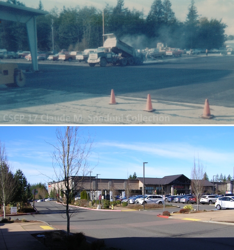 The Now photo shows the second-growth forest behind the parking lot has been replaced by the Gig Harbor Fred Meyer store.
