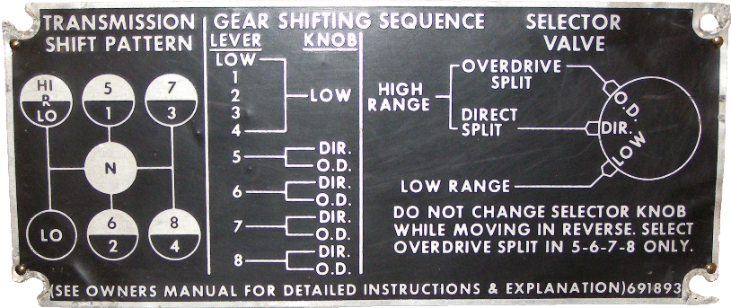 In the Gear Shifting Sequence on the plate below, the gears are numbered 1 through 8. Adding low gear, plus a second speed (overdrive) in each of 5, 6, 7 and 8, equals 13 speeds.