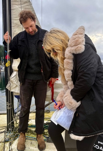 Kim Cofer signs off on the sale of the Katrinka, netting $1 in the process. Photo by Chapin Day