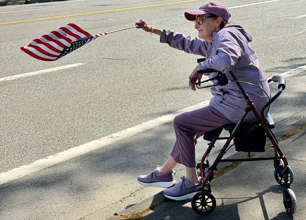 Then there was 80-year old Sarasue Essenprais, signless and leaning forward on the brakes handles of her wheel chair to wave her dowel-mounted flag at the passing cars.