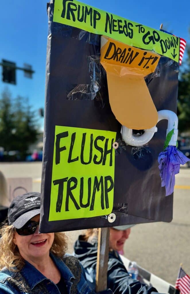 Another woman was among the most frequently photographed during the event. Her poster utilized plumbing fixtures to graphically indicate her less than admiring feelings about the president.