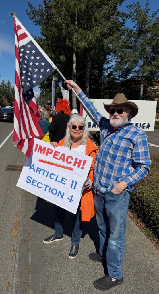 His wife Debbie, added, “And the world too, from what I see.” Her poster cited the Constitution’s Article Two, Section Four dealing with impeachment.