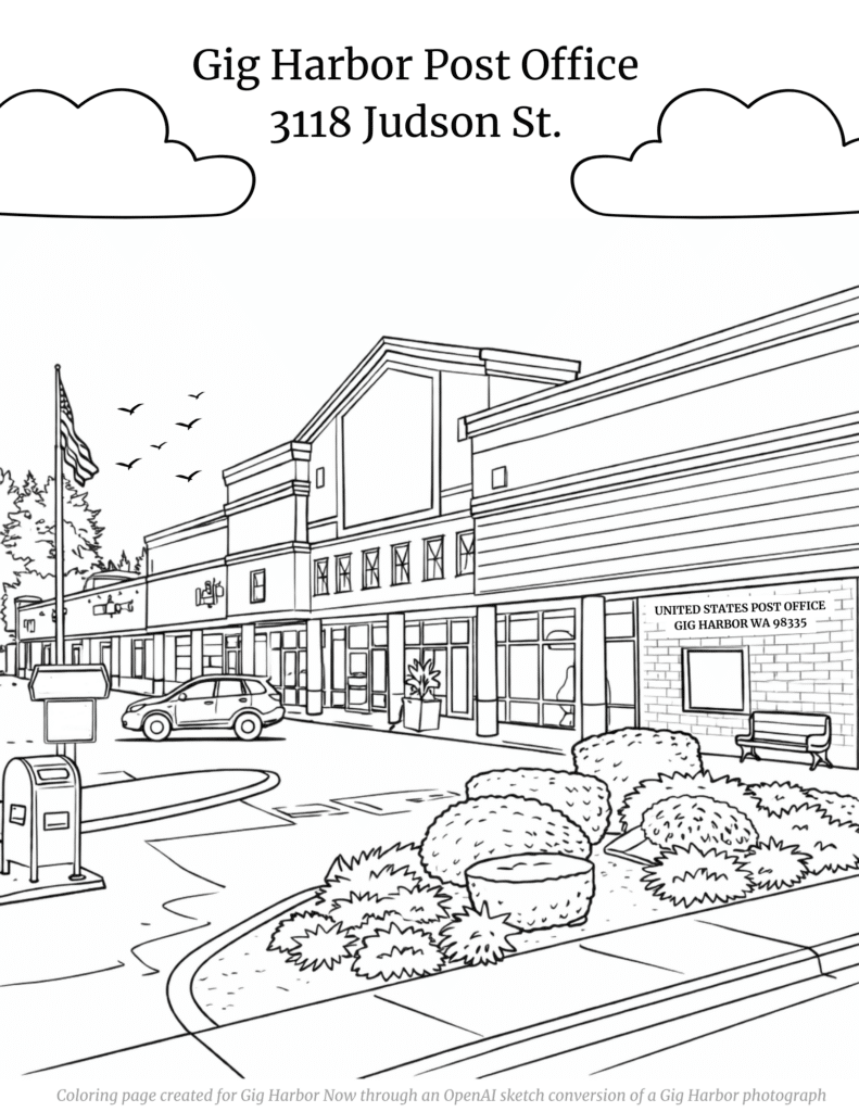 Elsewhere, you can also download my snazzy coloring page of Gig Harbor’s very own post office building on Judson Street. “Made” is a fluid word, by the way. What I actually did for the first time was prompt one of those online image generators to transform a real life photo of the Gig Harbor Post office into a cool line-drawn vector file. And it did the job. Then I brought it back over to my design program to add some final touches.