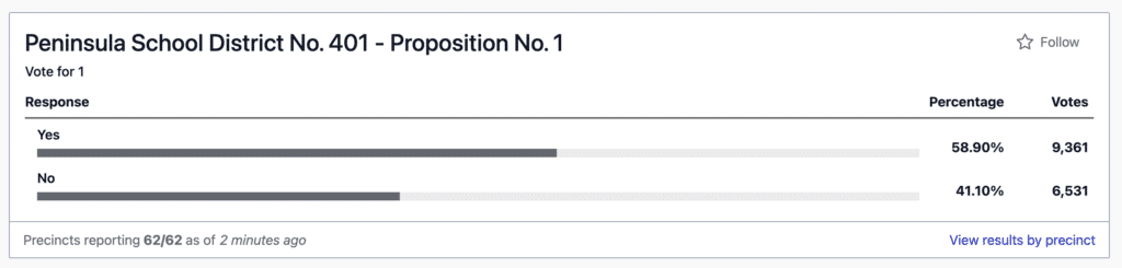 Voters approved the Peninsula School District’s “Replacement Educational Programs and Operations” levy, according to early vote totals posted on Tuesday, Feb. 10.