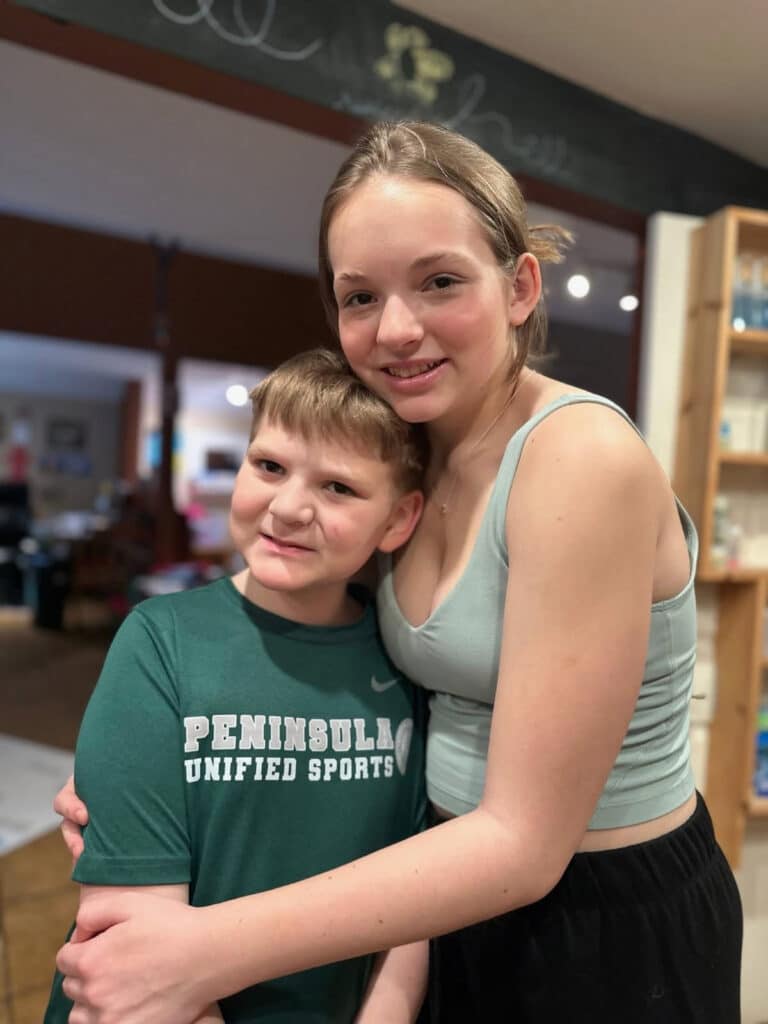 Connor Boman, a Peninsula High School graduate now with Peninsula School District’s Community Transitions Program, and Riley DuCharme, a Peninsula High junior, celebrate the school being named a Special Olympics Unified Champion School, on Dec. 12, 2025, at Peninsula High School. Photo by Christina T. Henry