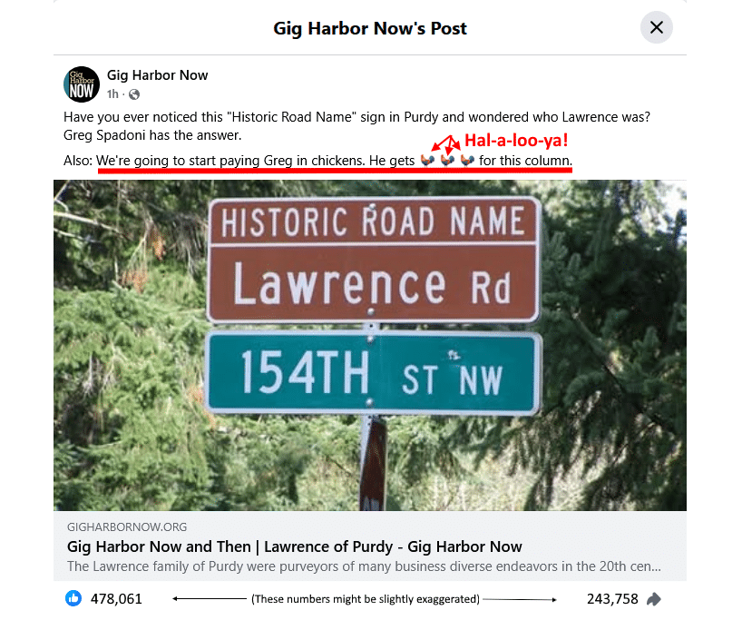 Behind the scenes, our previous Gig Harbor Now and Then column was a watershed moment. While I was not informed directly, it was brought to my attention that due to my story on the Lawrence family of Purdy, I’m about to get a raise! For those who didn’t see it, the news appeared on the Gig Harbor Now Facebook page, and looked like this (with a couple comments added by me):
