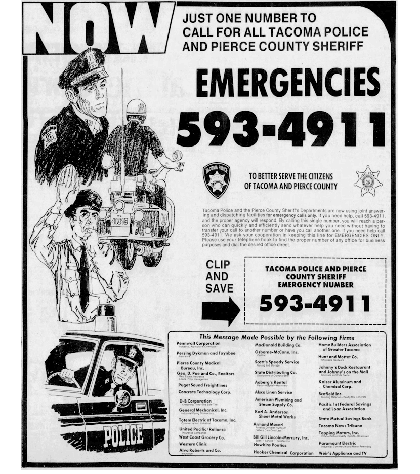 In 1974, the Pierce County Sheriff’s Office and the Tacoma Police (and later the Tacoma Fire Department) combined their call centers into one, but only for local callers (it was still a long-distance call from the Peninsula at that time). The last three digits of the new number were 911, chosen in anticipation of an eventual switch to those three digits alone.