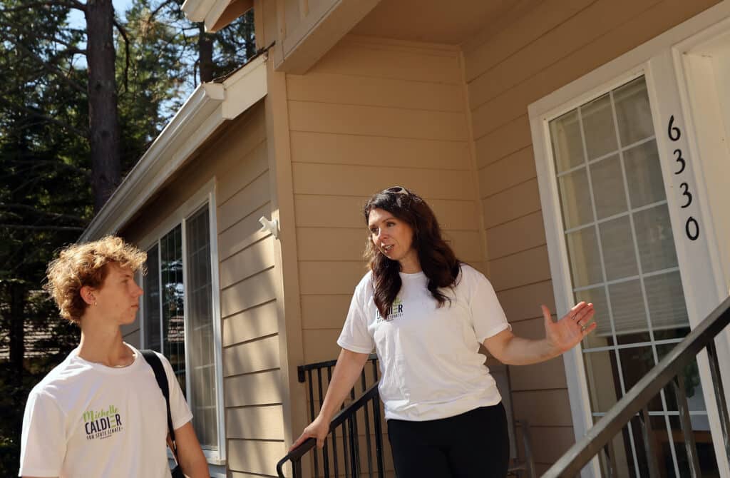 Rep. Michelle Caldier and her nephew Conner Smith, left, get ready to head to the next house while doorbelling in Port Orchard’s McCormick Woods neighborhood on Sept. 20, 2025. Photo by Meegan M. Reid/Kitsap Sun