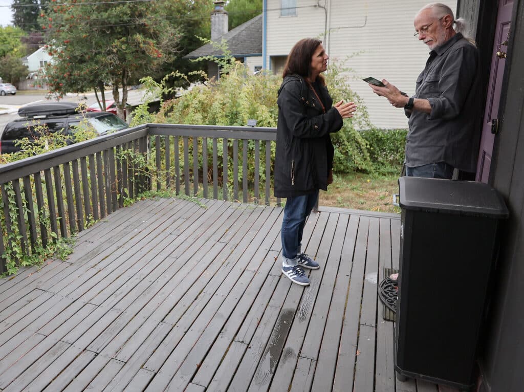 Sen. Deb Krishnadasan talks with David Hartman as he looks over her campaign literature on the porch of his home in Bremerton on Sept. 29, 2025. Photo by Meegan M. Reid/Kitsap Sun