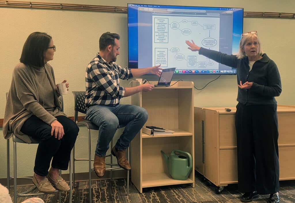 District 7 representatives to the Pierce County Charter Review Commission — from left, Brenda Lykins, Justin Leighton and Martha Lantz — talk about the process at a “listening session” on March 7 in Lakebay. Photo by Vince Dice