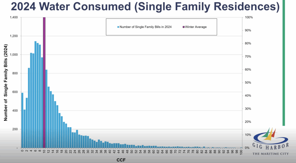 Langhelm also detailed how much water customers could expect their bills to change — mostly, he said, for the better. For instance, he said, displaying a water use rate graph, “we had a lot of questions at the last council meeting about what does 10 CCF [centum cubic feet] get you? Does it get you one long teenager shower? No, it gets you more than that.”