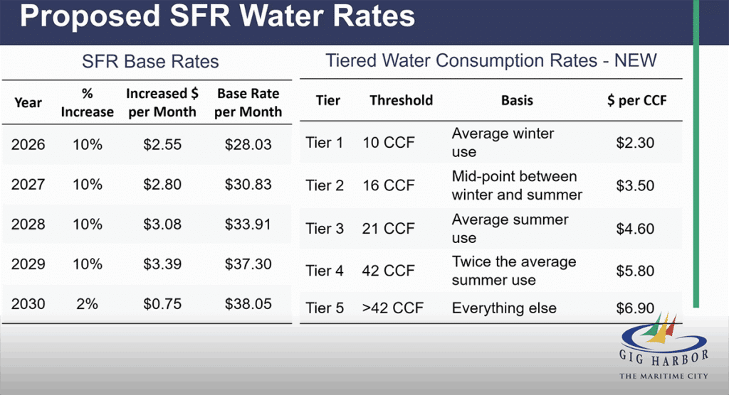 The rate increase was planned to go into effect Jan. 1, 2026. But at the council’s last meeting, Gig Harbor resident Lynn Stevenson told the council that she was concerned that few residents knew about the proposed increases. Because of this, she also wondered whether the rate increases had to take place on the first of the year.