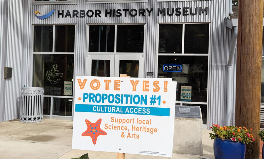 Signs posted in front of the Harbor History Museum urge a yes vote on the cultural access proposition. Photo by Vince Dice