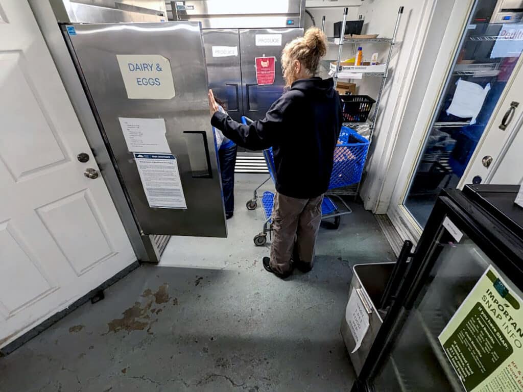 The food pantry currently has about 460 square feet of space for shoppers. Refrigerators and shelving covers much of it, creating narrow paths or “pinch points,” as Higgins says. Multiple shopping carts can barely squeeze past each other at the same time.