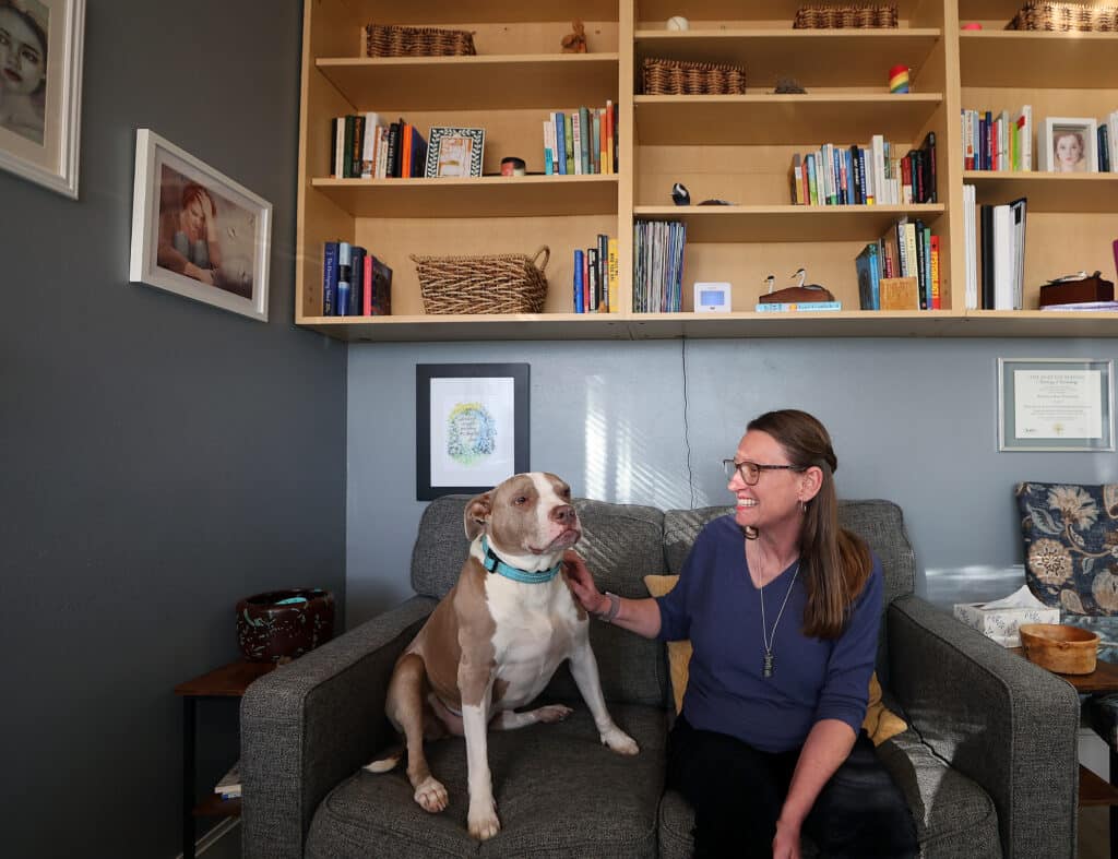 Rebecca Nystrom, therapist and owner of Healing Gardens Counseling pets her dog Lily in her office in Bremerton on Tuesday, Jan. 20, 2026. Photo by Meegan M. Reid/Kitsap Sun
