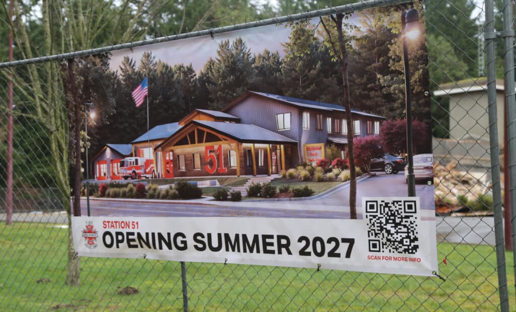 A sign outside the construction site shows what Gig Harbor Fire and Medic One’s new Station 51 will look like when it re-opens. Photo by Vince Dice