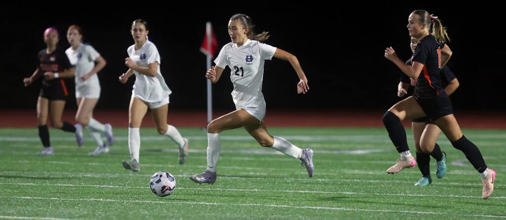 Violet Lester (21) scored Gig Harbor’s goal during a 1-1 draw against Central Kitsap on Tuesday, Oct. 7, 2025. Photo by Meegan M. Reid/Kitsap Sun