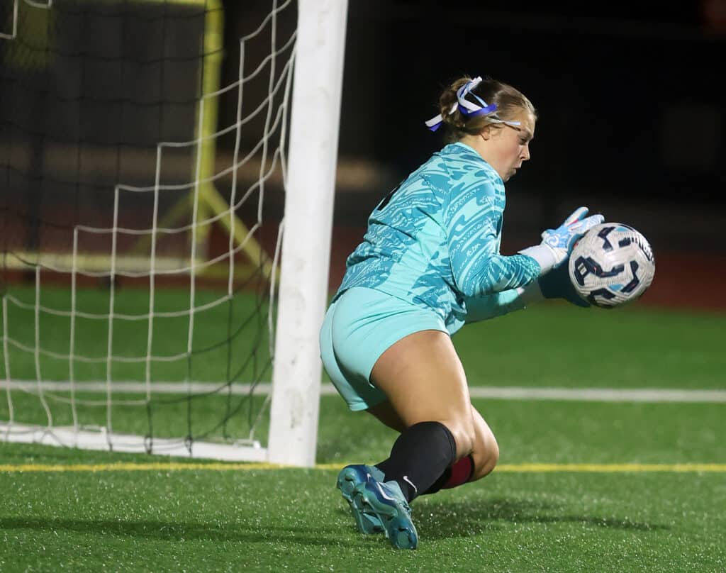 Gig Harbor goalkeeper Ella Conrad (1) makes a save during their 1-1 draw with Central Kitsap on Tuesday, Oct. 7, 2025. Photo by Meegan M. Reid/Kitsap Sun