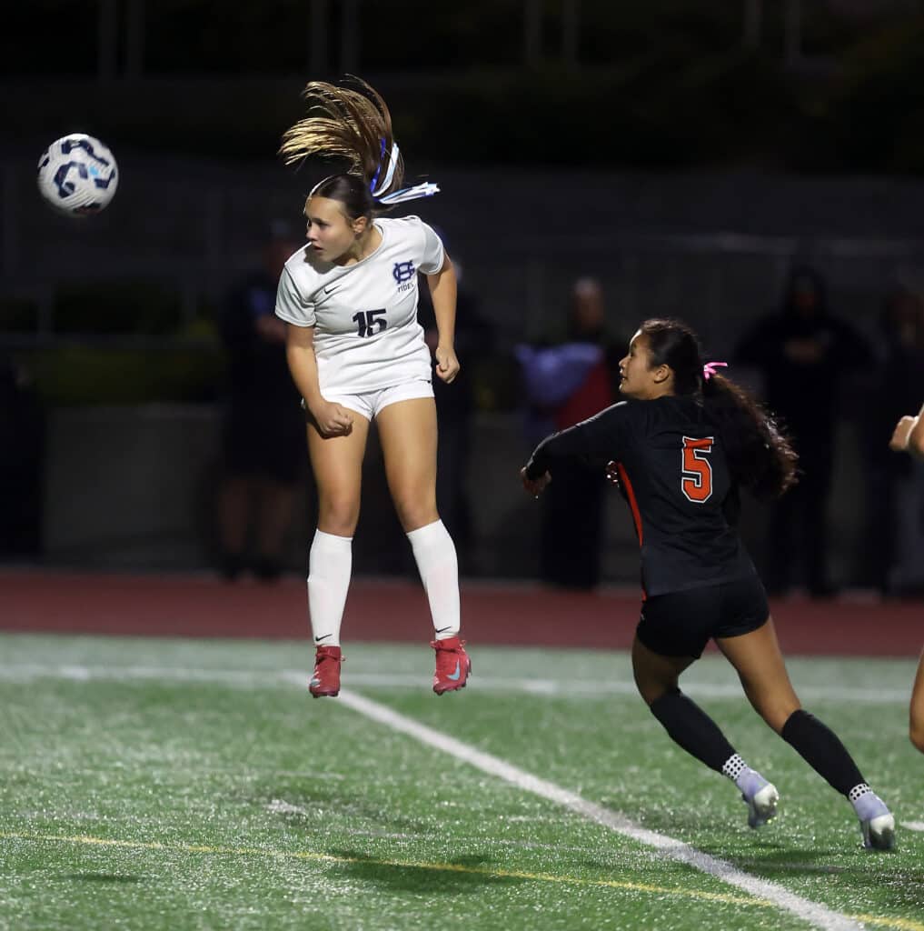 Gig Harbor’s Janelle Jones (15) heads the ball during their 1-1 draw against Central Kitsap on Tuesday, Oct. 7, 2025. Photo by Meegan M. Reid/Kitsap Sun