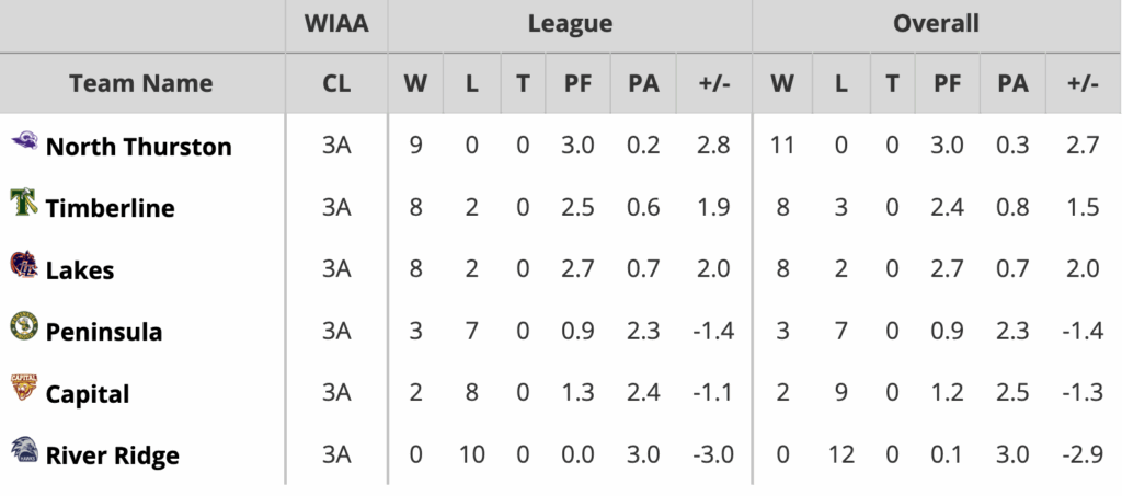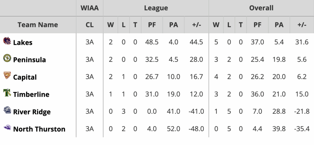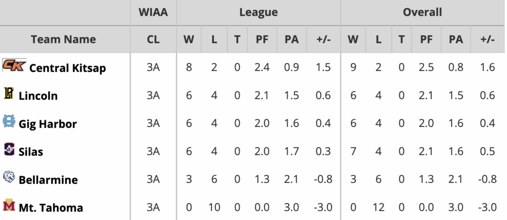 Puget Sound League Nisqually Division football standings as of Oct. 9.