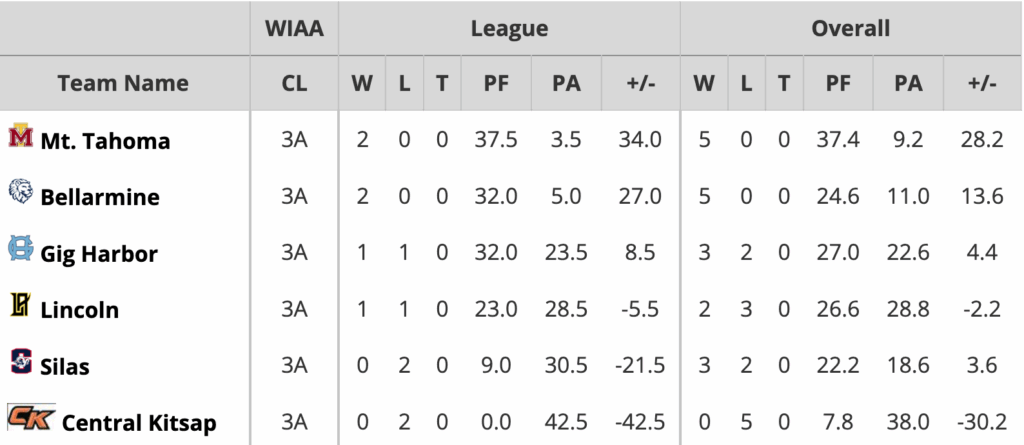 Puget Sound League Narrows Division football standings as of Oct. 9.
